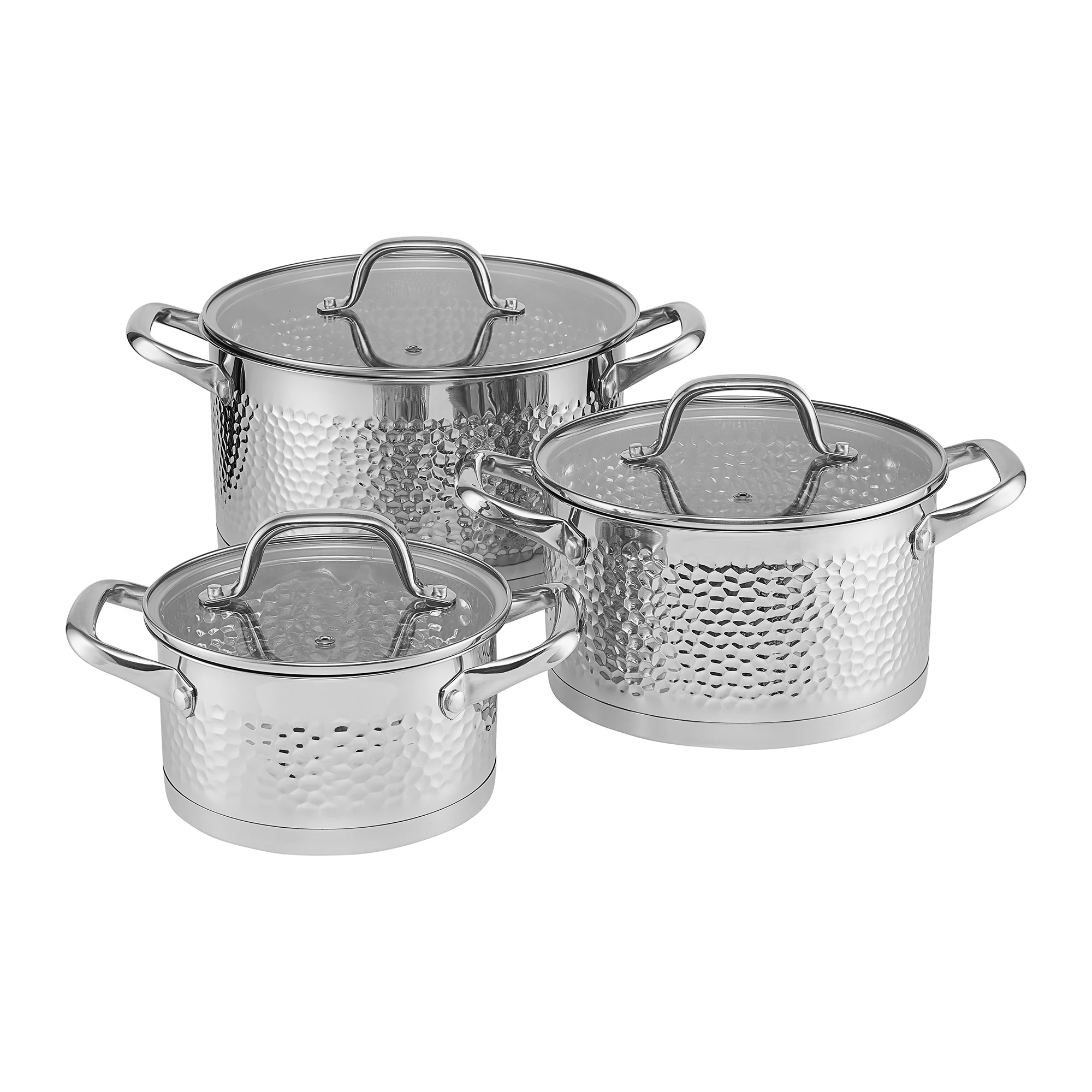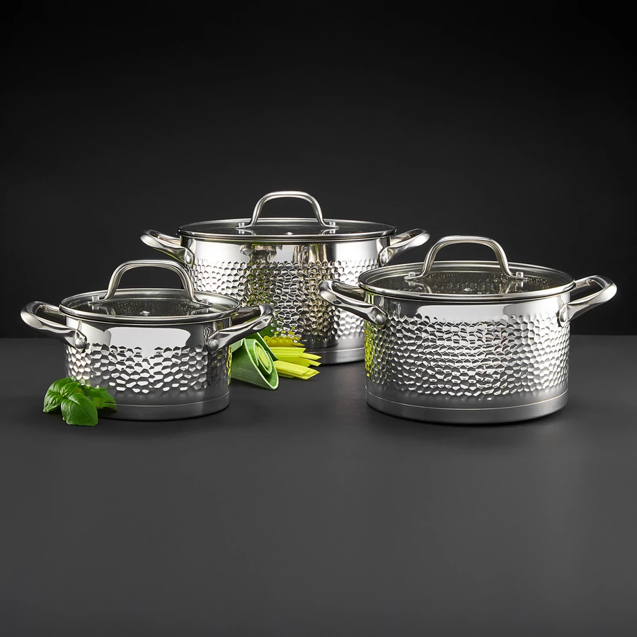 Rozsdamentes acél edénykészlet kalapácsolt felülettel A Bubble acél edénykészlet a modern dizájnt ötvözi a mindennapi főzés praktikumával. Az edények kiváló minőségű rozsdamentes acélból készültek, elegáns, kalapácsolt felületük pedig egyedi karaktert kölcsönöz nekik. Egyszerű formájuk és időtlen megjelenésük tökéletesen illeszkedik bármilyen konyhába – legyen az klasszikus vagy modern. Minden edény üvegfedővel rendelkezik, amely lehetővé teszi a főzési folyamat nyomon követését anélkül, hogy levenné a fedelet. A belső falon található beépített kapacitásskála megkönnyíti a megfelelő folyadékmennyiség mérését. Az edények minden típusú tűzhelyen alkalmasak, beleértve az indukciósat is, és mosogatógépben moshatók. Anyag: Kiváló minőségű rozsdamentes acél kalapácsolt felülettel Fedél: Üvegfedél a főzés egyszerű ellenőrzéséhez Funkcionalitás: Praktikus kapacitásskála a belső falon Dizájn: Elegáns, kalapácsolt felület és klasszikus forma Sokoldalú: Minden típusú tűzhelyen alkalmas, beleértve az indukciót is Könnyű használat: Mosogatógépben mosható Részletek Készlet tartalma: 1 x 16 cm-es edény fedővel: Teljes űrtartalom: 1,9 l Hasznos űrtartalom: 1,5 l Hossz: 25 cm Szélesség: 17,3 cm Magasság: 9,7 cm Fűtőzóna átmérője: 15,5 cm Falvastagság: 0,5 mm 1 x 20 cm-es edény fedővel: Teljes űrtartalom: 3,6 l Hasznos űrtartalom: 3,5 l Hossz: 29 cm Szélesség: 21,3 cm Magasság: 11,7 cm Fűtőzóna átmérője: 19,5 cm Falvastagság: 0,5 mm 1 x 24 cm-es edény fedővel: Teljes űrtartalom: 6,2 l Hasznos űrtartalom: 6 l Hossz: 34 cm Szélesség: 25,3 cm Magasság: 13,7 cm Fűtőzóna átmérője: 23,5 Falvastagság: 0,5 mm