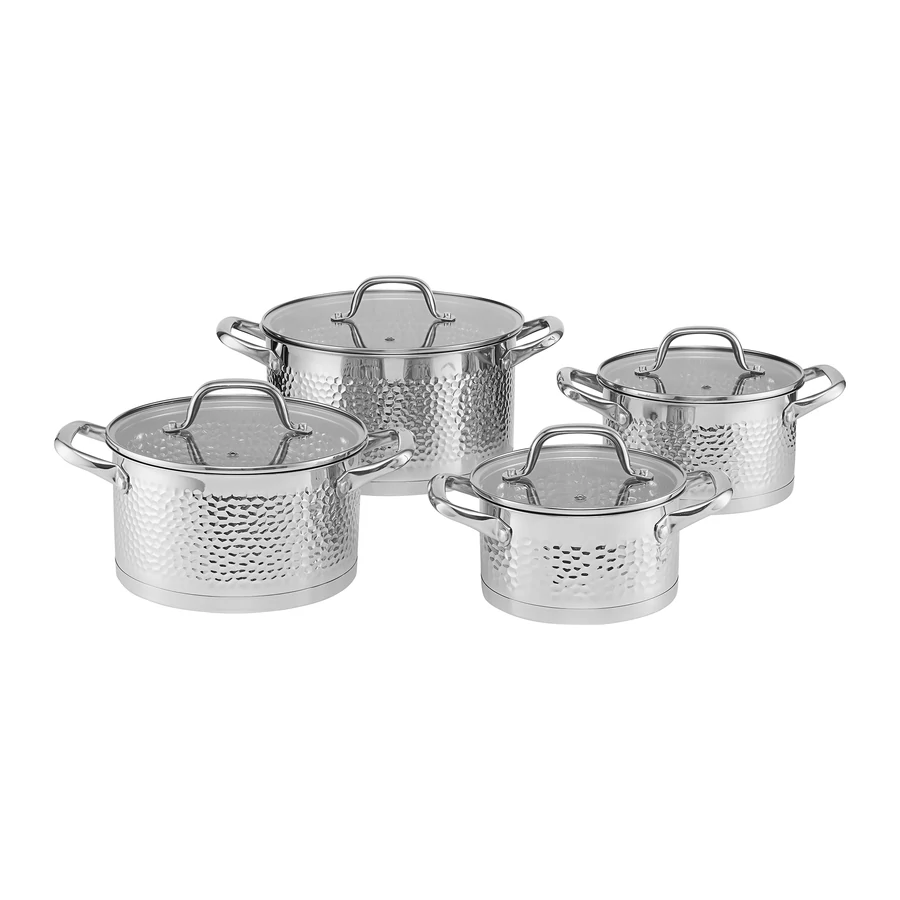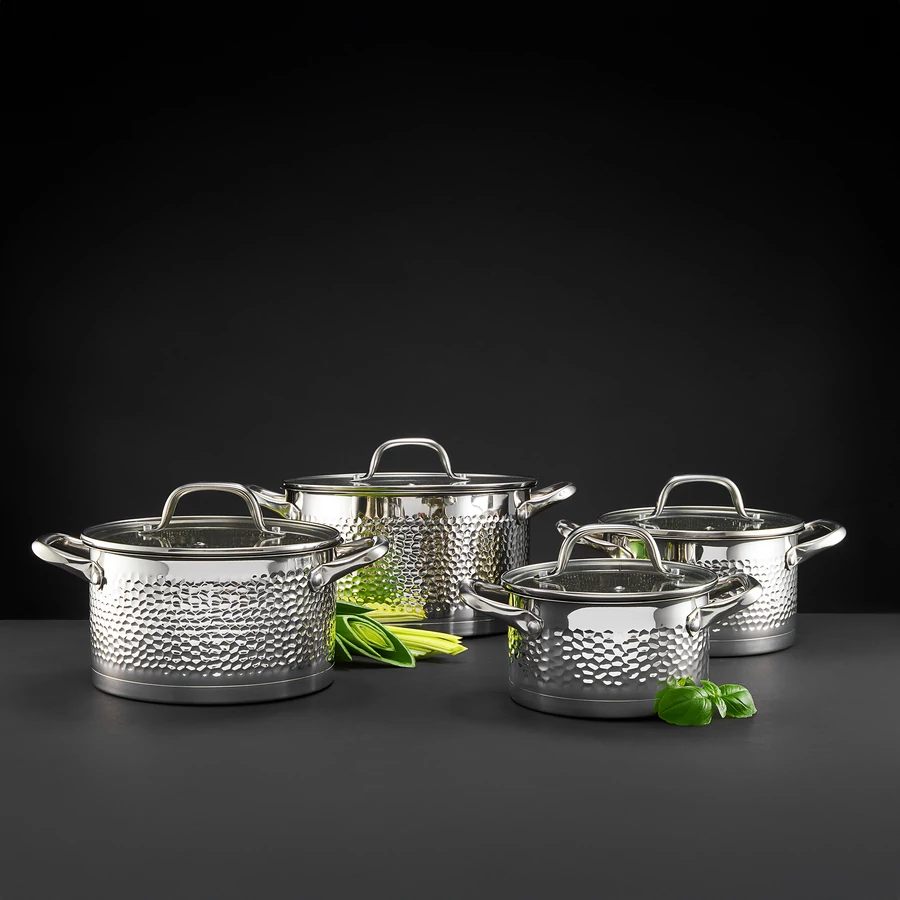 Rozsdamentes acél edénykészlet kalapácsolt felülettel A Bubble acél edénykészlet a modern dizájnt ötvözi a mindennapi főzés praktikumával. Az edények kiváló minőségű rozsdamentes acélból készültek, elegáns, kalapácsolt felületük pedig egyedi karaktert kölcsönöz nekik. Egyszerű formájuk és időtlen megjelenésük tökéletesen illeszkedik bármilyen konyhába – legyen az klasszikus vagy modern. Minden edény üvegfedővel rendelkezik, amely lehetővé teszi a főzési folyamat nyomon követését anélkül, hogy levenné a fedelet. A belső falon található beépített kapacitásskála megkönnyíti a megfelelő folyadékmennyiség mérését. Az edények minden típusú tűzhelyen alkalmasak, beleértve az indukciósat is, és mosogatógépben moshatók. Anyag: Kiváló minőségű rozsdamentes acél kalapácsolt felülettel Fedél: Üvegfedél a főzés egyszerű ellenőrzéséhez Funkcionalitás: Praktikus kapacitásskála a belső falon Dizájn: Elegáns, kalapácsolt felület és klasszikus forma Sokoldalú: Minden típusú tűzhelyen alkalmas, beleértve az indukciót is Könnyű használat: Mosogatógépben mosható Részletek Készlet tartalma: 1 x 16 cm-es edény fedővel: Teljes űrtartalom: 1,9 l Hasznos űrtartalom: 1,5 l Hossz: 25 cm Szélesség: 17,3 cm Magasság: 9,7 cm Fűtőzóna átmérője: 15,5 cm Falvastagság: 0,5 mm 1 x 18 cm-es edény fedővel: Teljes űrtartalom: 2,7 l Hasznos űrtartalom: 2,5 l Hossz: 27 cm Szélesség: 19,3 cm Magasság: 10,7 cm Fűtőzóna átmérője: 15,5 cm Falvastagság: 0,5 mm 1 x 20 cm-es edény fedővel: Teljes űrtartalom: 3,6 l Hasznos űrtartalom: 3,5 l Hossz: 29 cm Szélesség: 21,3 cm Magasság: 11,7 cm Fűtőzóna átmérője: 19,5 cm Falvastagság: 0,5 mm 1 db 24 cm-es fedős edény Teljes űrtartalom: 6,2 l Hasznos űrtartalom: 6 l Hossz: 34 cm Szélesség: 25,3 cm Magasság: 13,7 cm Fűtőzóna átmérője: 23,5 cm Falvastagság: 0,5 mm