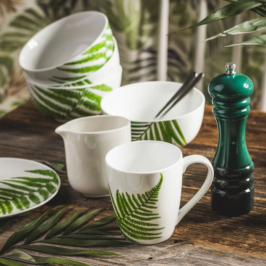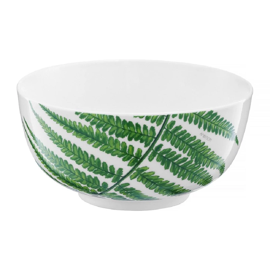 Pura Vida salátástál 14 cm-es átmérővel. Klasszikus forma, modern trópusi mintával. Tökéletesen passzol a fehér vagy zöld árnyalatú étkészletekhez.