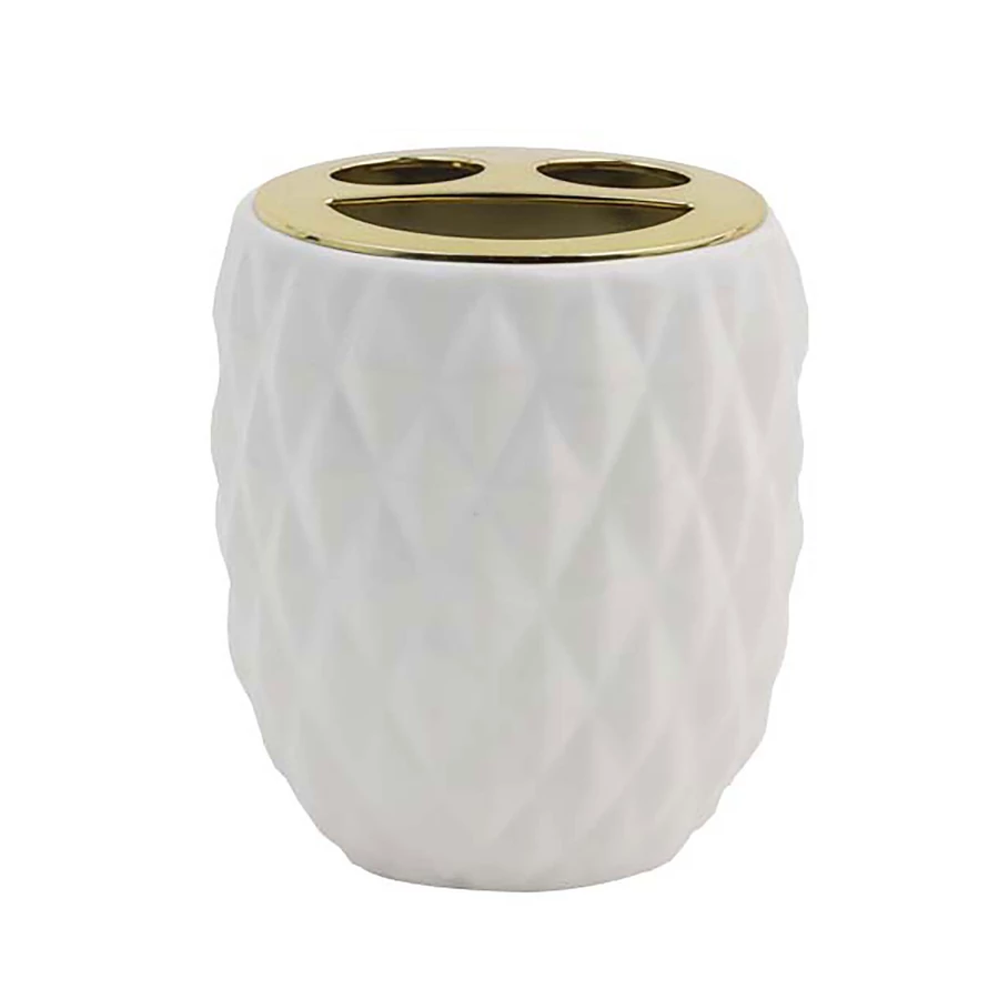 A stílusos Jotta Lavado bögre egy funkcionális fürdőszobai kiegészítő, amely formájával és kidolgozásával vonzza a figyelmet. Gyémánttal domborított fehér felületét feltűnő arany perforált fedél egészíti ki, amely nemcsak a fogkefe rendszerezését teszi lehetővé, hanem egyedi megjelenést is kölcsönöz neki. A bögre tartós dolomit kerámiából készült – nedvességálló és könnyen tisztítható. Elegáns kialakítása tökéletesen kiegészíti mind a modern, mind a klasszikus enteriőröket.