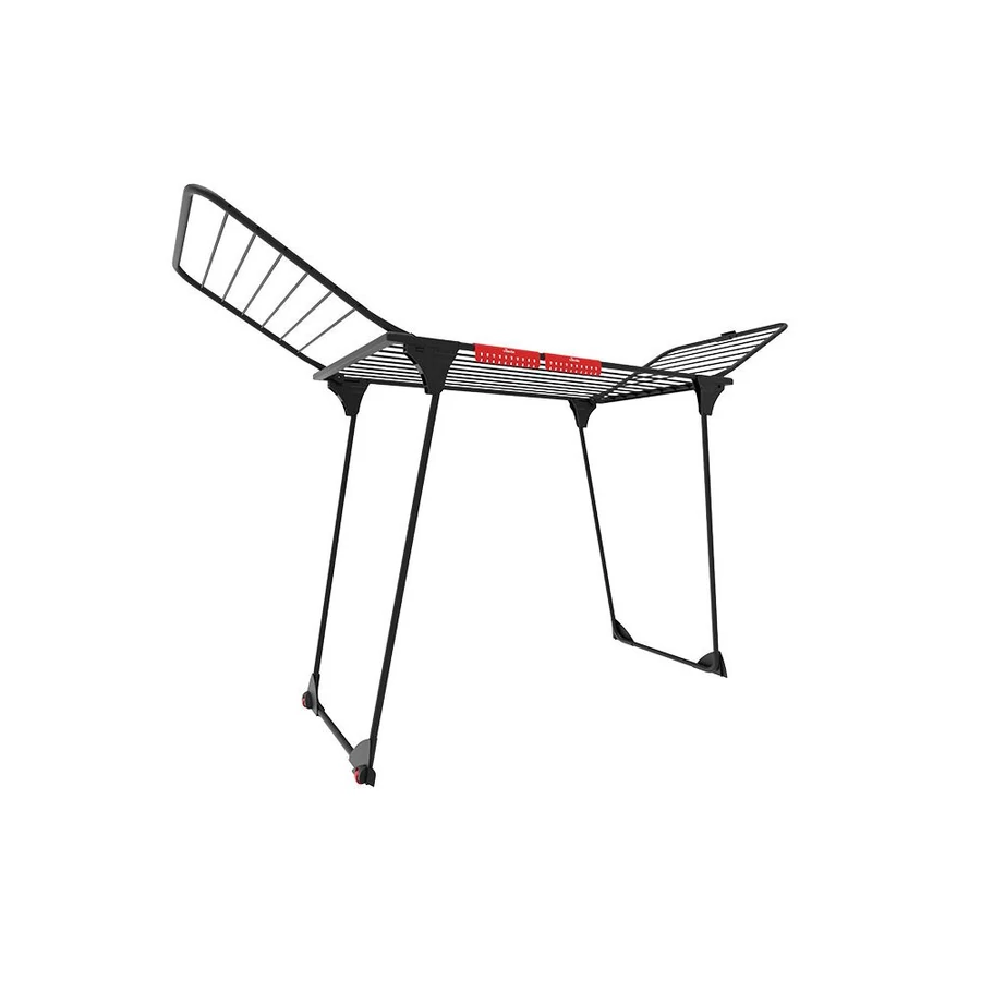 VILEDA King Ultimate fekete ruhaszárító A VILEDA King Ultimate fekete ruhaszárító kinyitva 174 cm x 56 cm x 112 cm méretű, 20 m szárítófelülettel rendelkezik, így akár két teljes adag ruhát is egyszerre száríthatsz rajta. A szárító tartós acélból készült, stabil konstrukciója és a szárító szárnyainak retesze biztosítja a biztonságos használatot, megakadályozva a nem kívánt összehajlást. A ruhaszárító XXL zsinórokkal van felszerelve, amelyek csökkentik a ruhák gyűrődését, így a vasalás sokkal könnyebb és gyorsabb lesz. Beépített kerekek segítségével a szárítót könnyedén mozgathatod, akár a ruhákkal együtt, így szabadon elhelyezheted a hálószobában, fürdőszobában vagy erkélyen. Két külön speciális fehérneműtartó gondoskodik a kényelmes és praktikus ruharendezésről, megtakarítva a helyet a fő állványon. A szárító összecsukva mindössze 13 cm x 56 cm x 106 cm, így könnyen tárolható, és kevés helyet foglal.